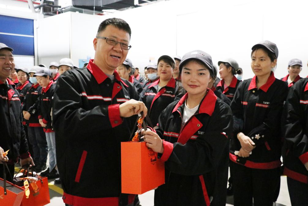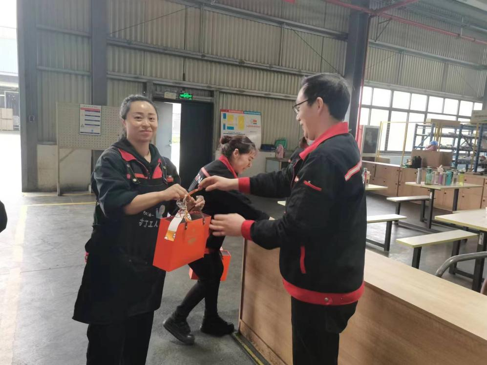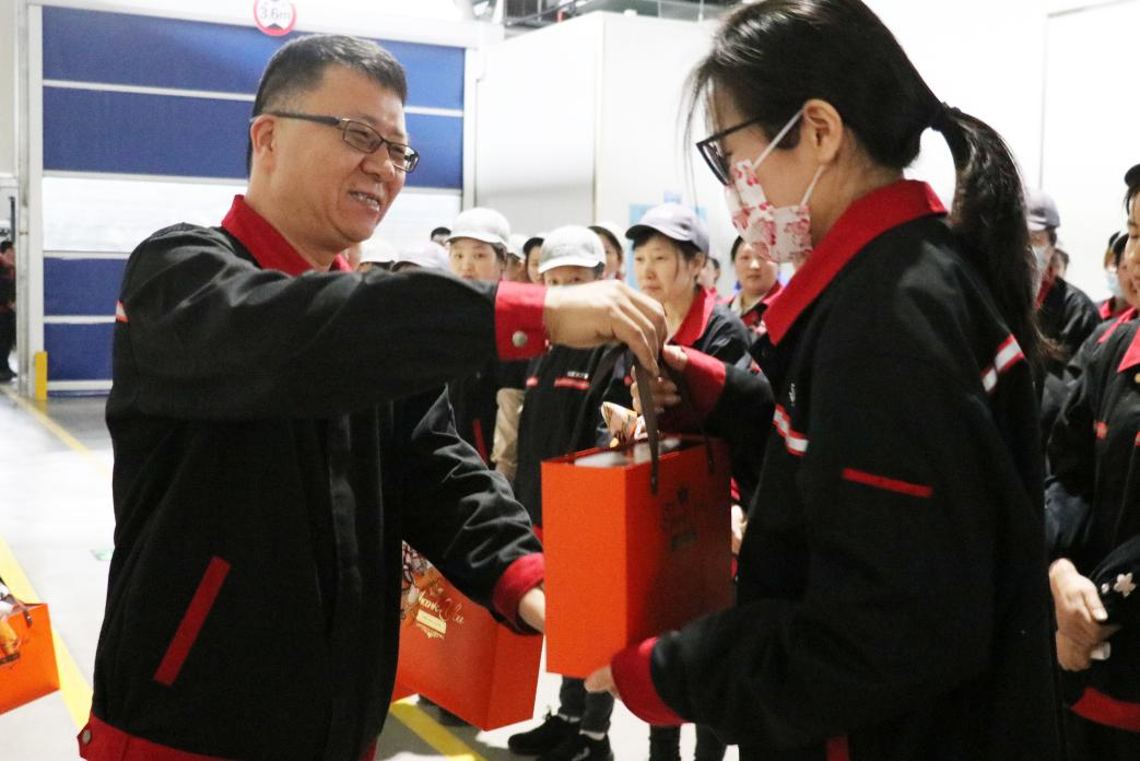 在總裝車間,浙江鑫可傳動(dòng)科技有限公司常務(wù)副總經(jīng)理馬強(qiáng)、總裝車間車間主任薛富斌為辛勤工作在各崗位的每一位女職工傳遞公司節(jié)日問候,送上溫馨的節(jié)日祝福及節(jié)日禮品。